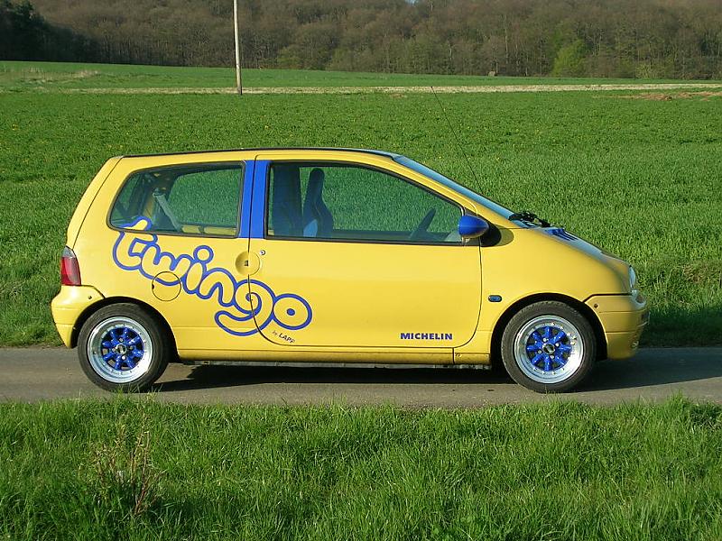 Am gelben Renault (kenne mich mit den Typbezeichnungen nicht aus - nicht der Twingo!) sieht es so aus, als wenn der Sturz an der Vorderachse nicht stimmt (positiv!).