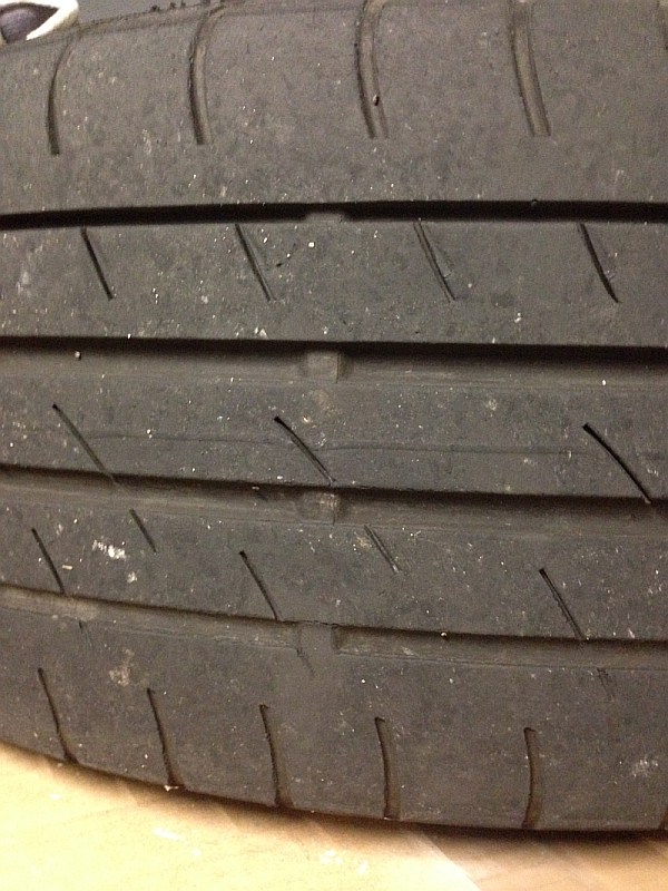 Interessanter Weise genau symmetrisch links und rechts, jeweils Innen fast an der Verschleißmarke. Mitte und Außen noch gut Profil.