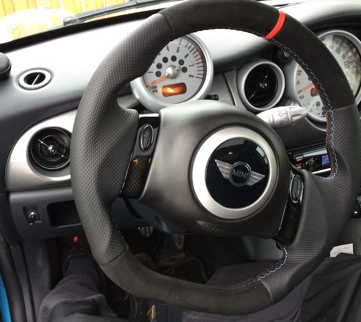 Da mein Kleiner auch Electric Blue mit weissem Dach ist und Hellblau und Rot im Bezug meiner Recaros ist, habe ich die Naht (Standardnaht) in Hellblau / Schwarz / Rot machen lassen. Weiss wollte ich nicht, da das mit der Zeit bestimmt schmuddelig aussieht.