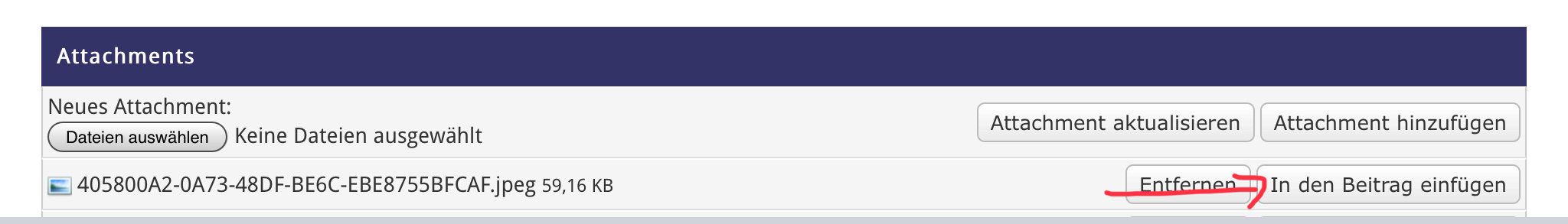 4. Das/die hochgeladene(n) Bild(er/Attachment(s) wird euch nun unter "Attachments" angezeigt. Jetzt im Textfeld auf die gewünschte Stelle tippen/klicken und die Schaltfläche "In den Beitrag einfügen" antippen/-klicken:
