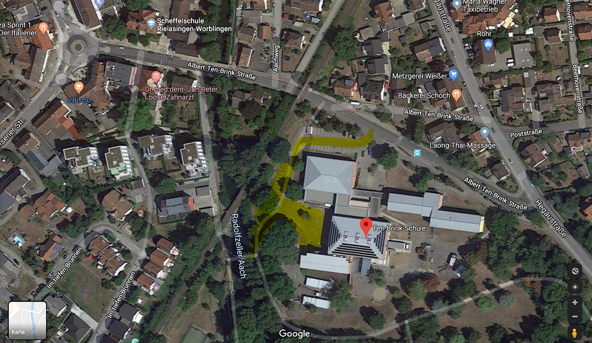 Treffpunkt ist der hintere Parkplatz der Ten Brink Schule in 78224 Rielasingen (Toilette in der Nähe) siehe auch Bild bzw. die gelbe Markierung, wie man da hin kommt seht ihr auf dem Bild 1 und 2.