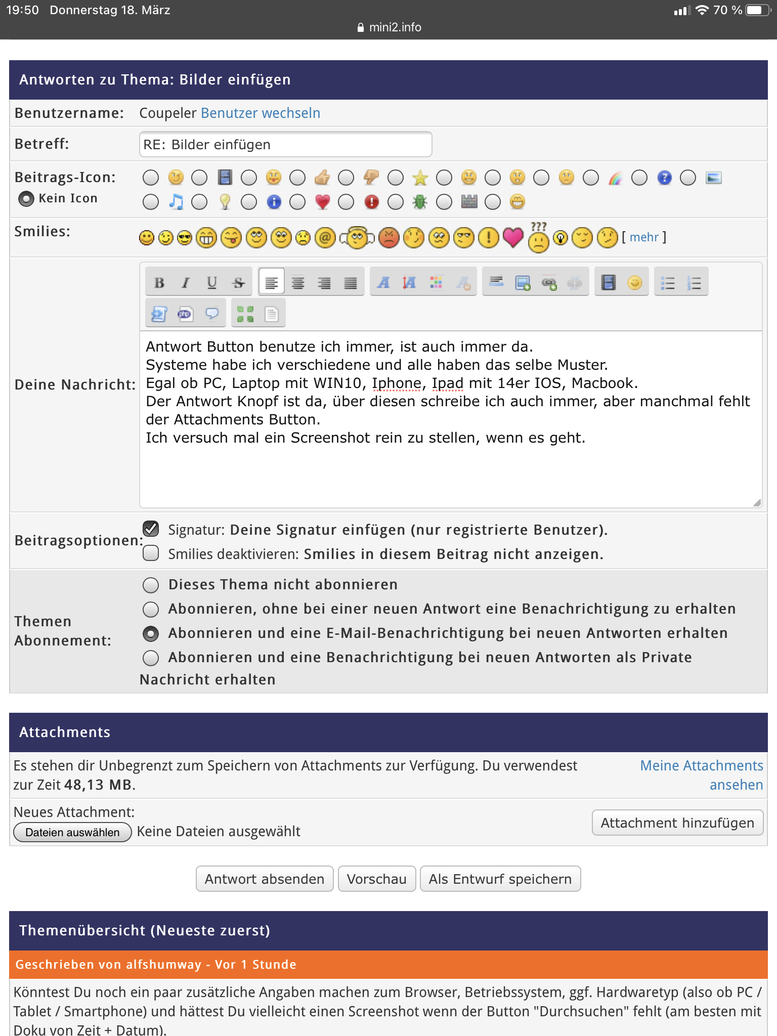 Der Antwort Knopf ist da, über diesen schreibe ich auch immer, aber manchmal fehlt der Attachments Button.