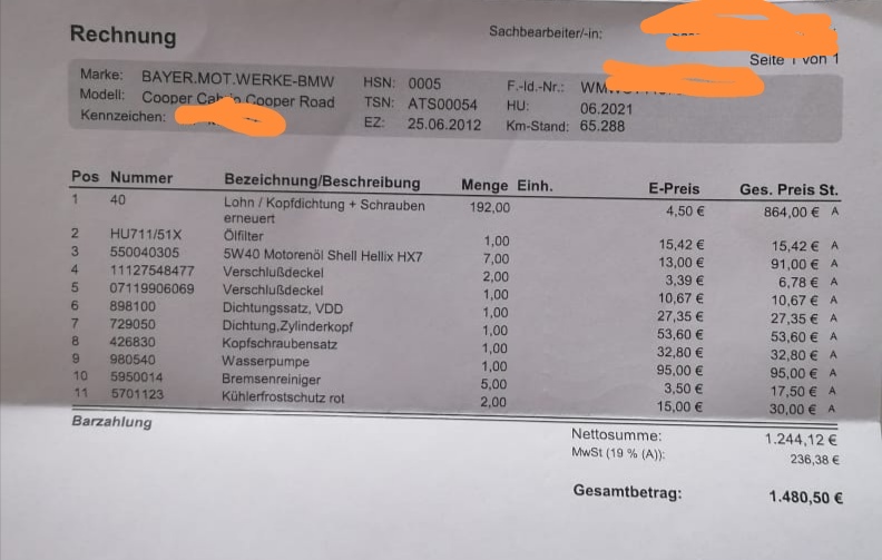 Hallo, bei mir wurde eine defekte Zylinderkopf dichtung festgestellt im Zusammenhang mit einem gelösten Deckel des Kühlwassers sowie einer leckenden Wasserpumpe. Im Öltank befand sich ein überhöhter Stand mit Gemisch aus (Kühl)wasser und Öl. Ist diese Rechnung ok? Ursprünglich war von 1200-1300 die Rede. Nach 500km soll nochmal ein Ölwechsel stattfinden. Es ist eine freie Werkstatt.