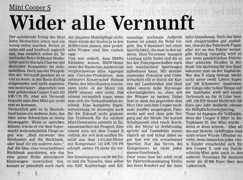 Mir gefällt der Artikel ganz gut und ich finde den Kleinen und seine guten und schlechten Seiten passend charakterisiert. Ist eben Interpretationssache, was man am MINI als 'gut' oder 'schlecht' bewertet...