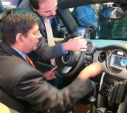 Kommunikationszentrale für den Autoradio-Schacht: Intels VP Anand Chandrasekher in einem BMW Mini Cabrio auf dem Intel-Stand. Der Car-PC von EPPD sorgte für Aufmerksamkeit.